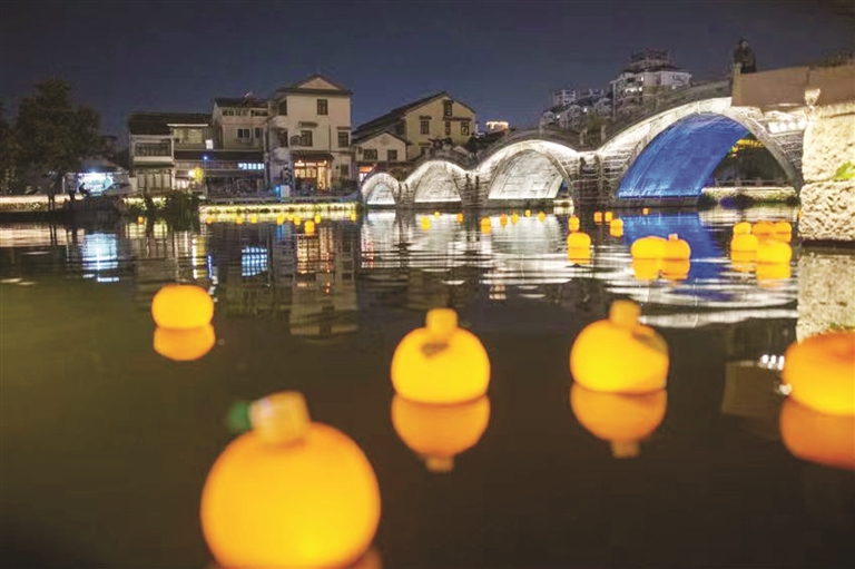21日晚,记者拿着一盏小橘灯,跟随大部队到了五洞桥放橘灯。晚上6点不到,五洞桥畔已是人头攒动,市民们徜徉在永宁河畔的桨声灯影中,品越剧、赏河灯,尝梅花糕、乌饭麻糍。听着古曲放完橘灯、许了心愿,沿着永宁江一路慢行至官河水街,一路上随处可见市民的笑脸。