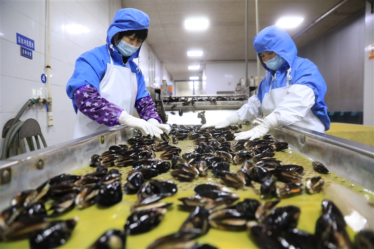 日前,工人们正在嵊泗县金盟海水养殖专业合作社自动化贻贝生产线加工贻贝。近年来,枸杞乡实施贻贝增产增值、蓝碳增汇等关键技术创新项目,聚力“机器换人”,推动贻贝全产业链提质增效。