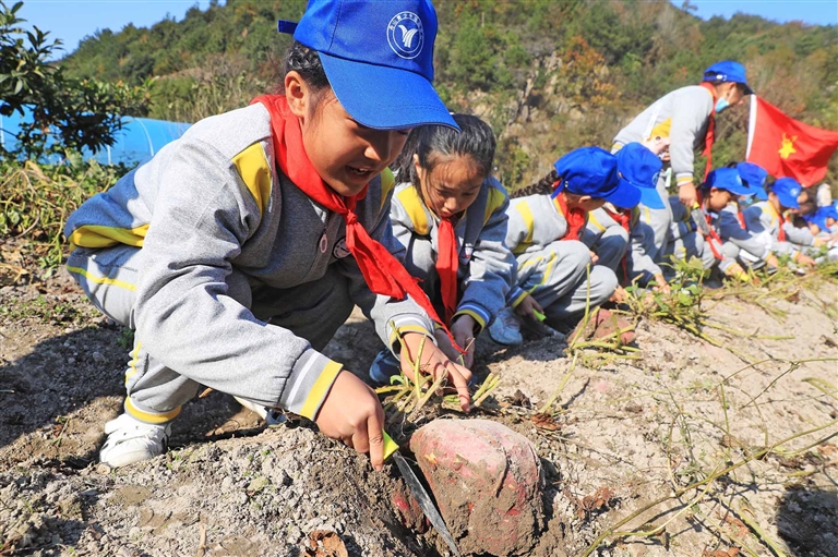 定海南洞艺谷,小学生正在体验挖番薯 记者 陈永建 摄