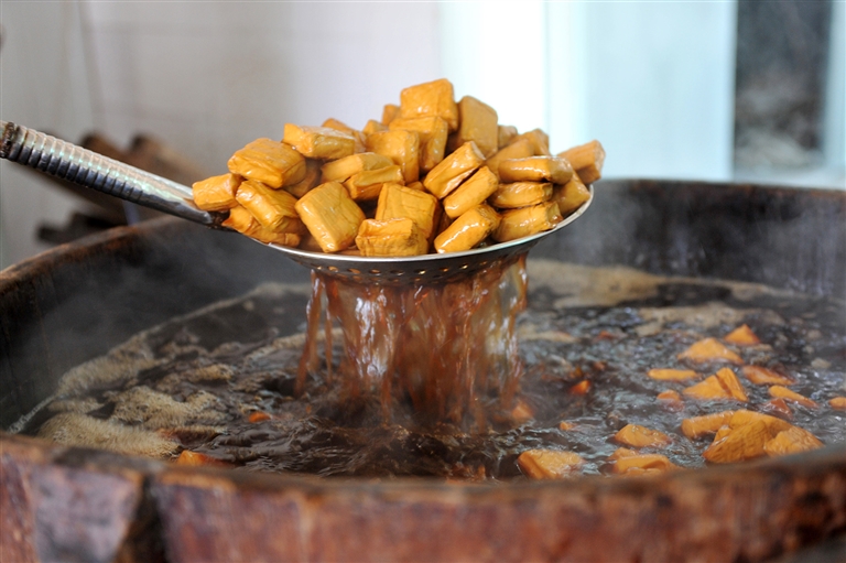 此外,大雪节气一到,舟山民间还有腌制“咸货”的习俗。将海盐加八角、桂皮、花椒等入锅炒熟,待炒过的花椒盐凉透后,涂抹在鱼、肉和光禽内外,反复揉搓,直到肉色由鲜转暗,表面有液体渗出时,再把肉连剩下的盐放进缸内,用石头压住,放在阴凉背光的地方,半月后取出,再将腌出的卤汁入锅加水烧开,撇去浮沫,放入晾干的禽畜肉,一层层码在缸内,倒入盐卤,再压上大石头,十日后取出,挂在朝阳的屋檐下晾晒干,以备过年之用。