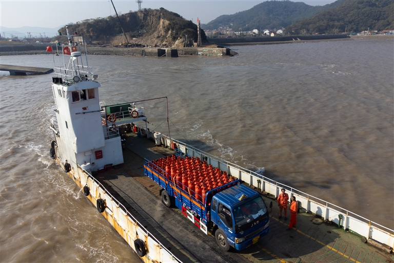 当天早上7时许,危险品专用船福顺1号靠上蚂蚁岛,装载180瓶燃气的危化品运输车缓缓驶下船,开至位于岛上后岙片区的燃气供应站。站内工作人员随即开始装卸工作。