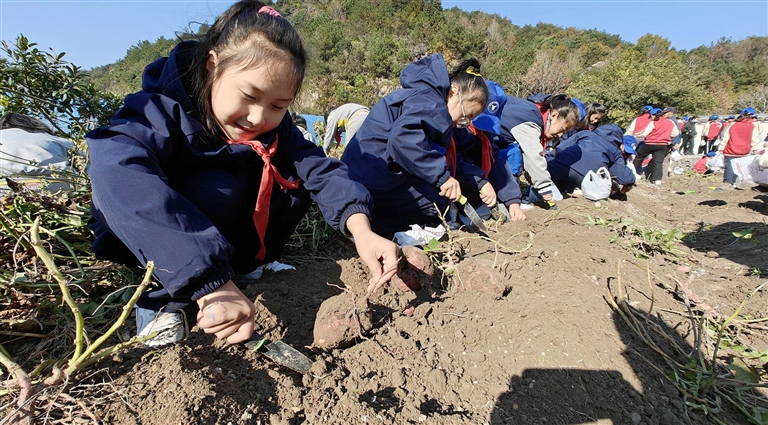 近日,在定海区干石览镇新建村农耕乐园,市青少年活动中心组织近百名青少年开展农耕收割丰收主题研学活动,通过走进田间地头科普农耕文化,感受丰收乐趣。 记者 陈永建 摄
