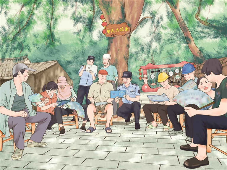 这是一幅电子插画:一棵大樟树枝繁叶茂,郁郁葱葱,众人围坐在树下吹着海风,喝着清茶,唠起了家常。两名民警在群众中间,一边聊天一边进行安防宣传。