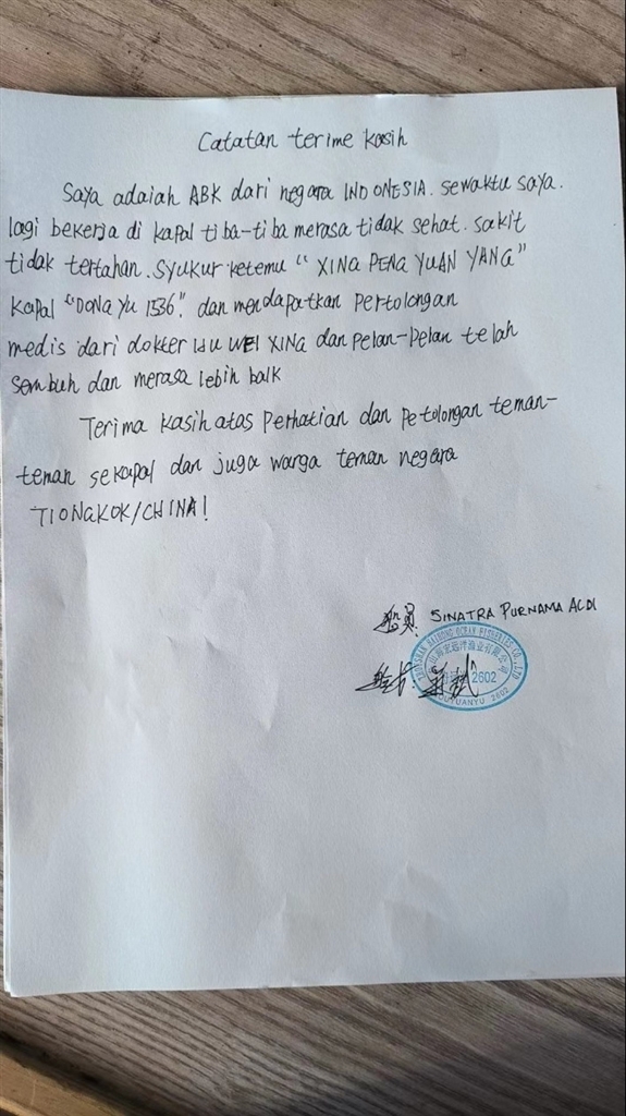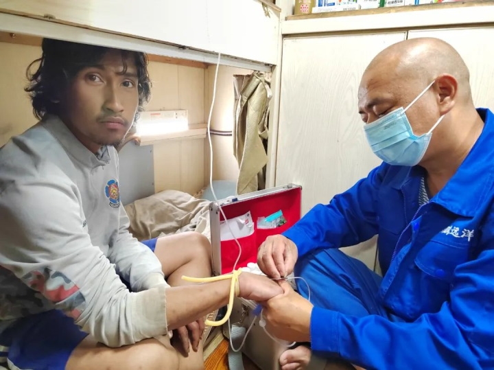 “兴鹏远洋”掌握具体情况后,第一时间调度正在附近的“东渔1536”船,放弃生产向“舟远渔2602”船靠近,并派遣船医胡卫星对患病的印尼籍船员进行救治。船医诊断后,经过3天的治疗和照料,印尼籍船员的病情终于得以好转。