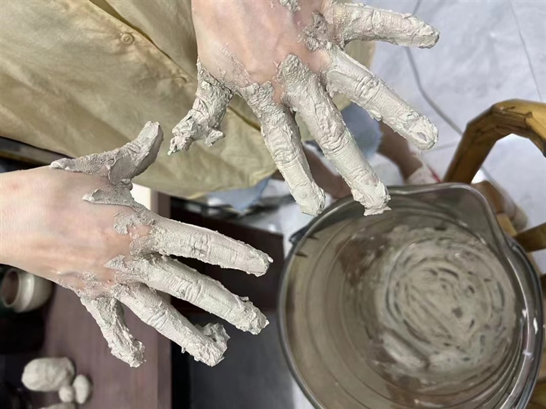 我们做壶的桌子叫做“泥凳”,大理石材质,转盘是不锈钢的,也是冰凉的。我在新疆这么冷的地方都没有长过冻疮,在宜兴的冬天,却破天荒长出了冻疮。