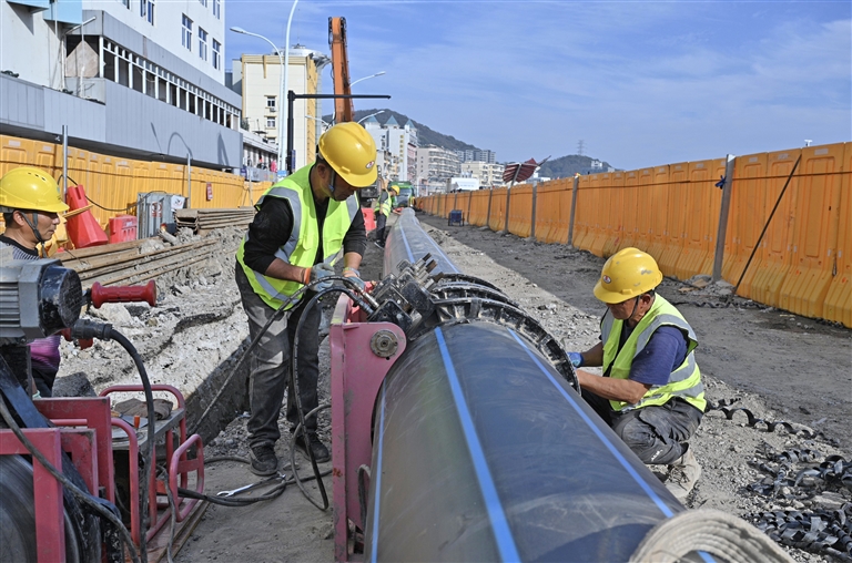 近日,沈家门滨港路正在进行水系管网提升改造。管网线路始于滨港公园南侧,终于沈家门夜排档西端,全长约2160米,主要进行雨污水管道敷设、路基水患处理、路面改造、景观氛围提升等,预计明年8月底完工。记者 沈磊 摄