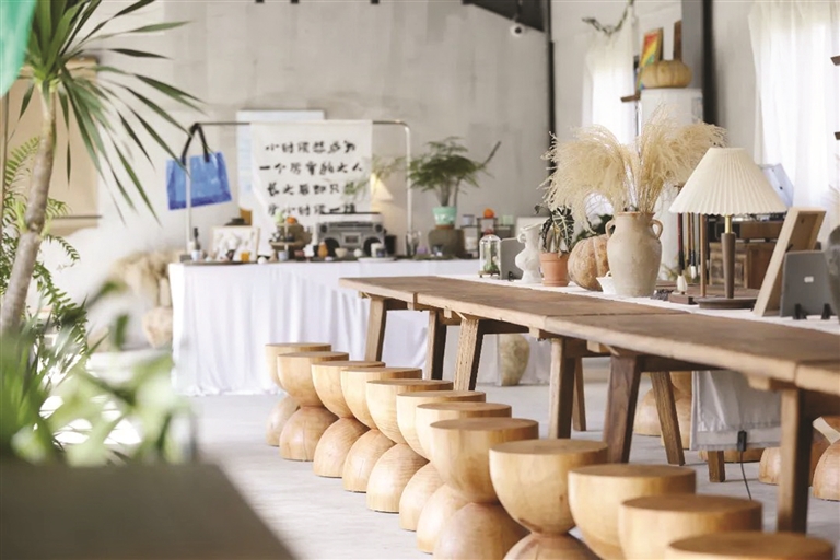 “看着水泥房很复古,我们想着做一个新旧结合的感觉,然后去村里淘了一些或者网上采购一些老物件,放在我们这个空间里, 这样感觉空间丰富了。”耕云造物社简约自然,大多是原木桌椅、棉麻装饰。屋内的摆设及装修,将在地文化与年轻人的新创意贯通,旧物件经过艺术美化和修复加工后再次被赋予新的生命力,实现艺术创研、农事体验、休闲娱乐等全链条服务。