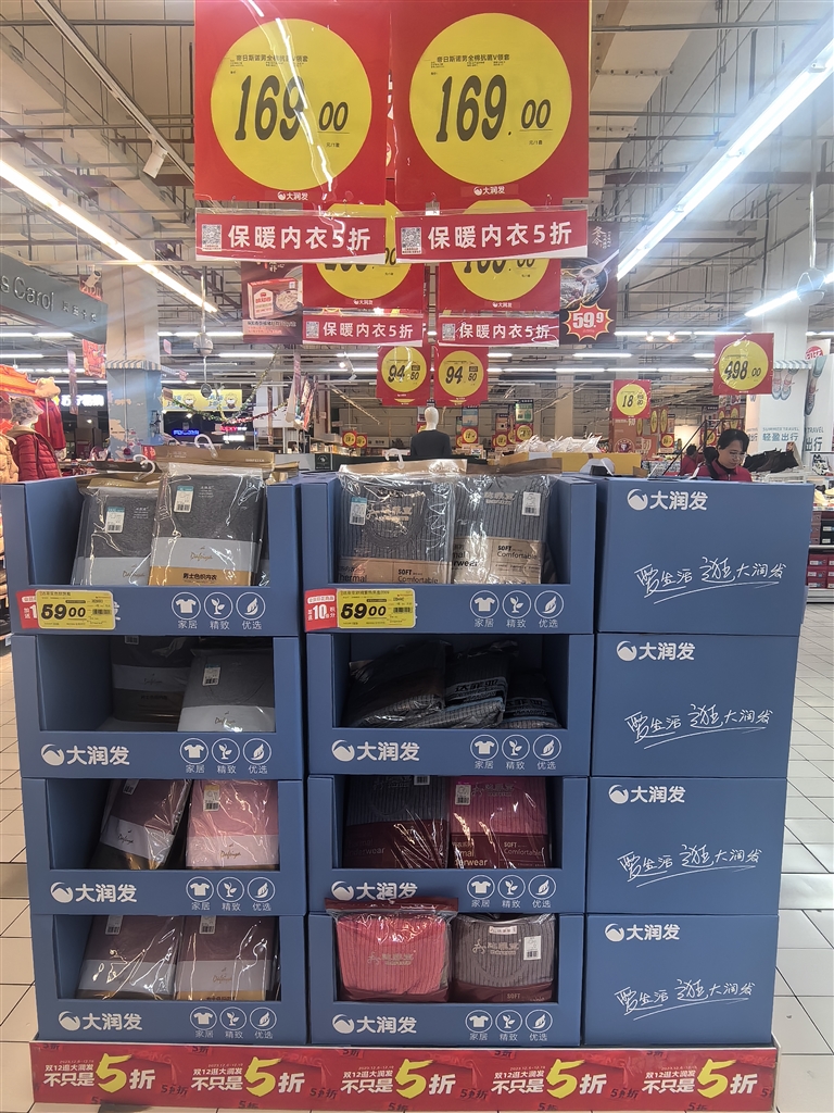 12月18日上午,记者走进东港大润发超市,在产品促销区,部分保暖内衣正在进行促销,个别品牌打出“不止是5折”的广告标语。在保暖内衣销售专区,男士保暖内衣和女士保暖内衣分区摆放,款式多样的保暖内衣中,全棉内衣仍旧占比最大。也有部分混纺内衣主打“蓄热”,但价格均高于全棉内衣。一套全棉内衣价格在一百五六十元,而主打“自发热”“蓄热”等功能的保暖内衣价格在两三百元。