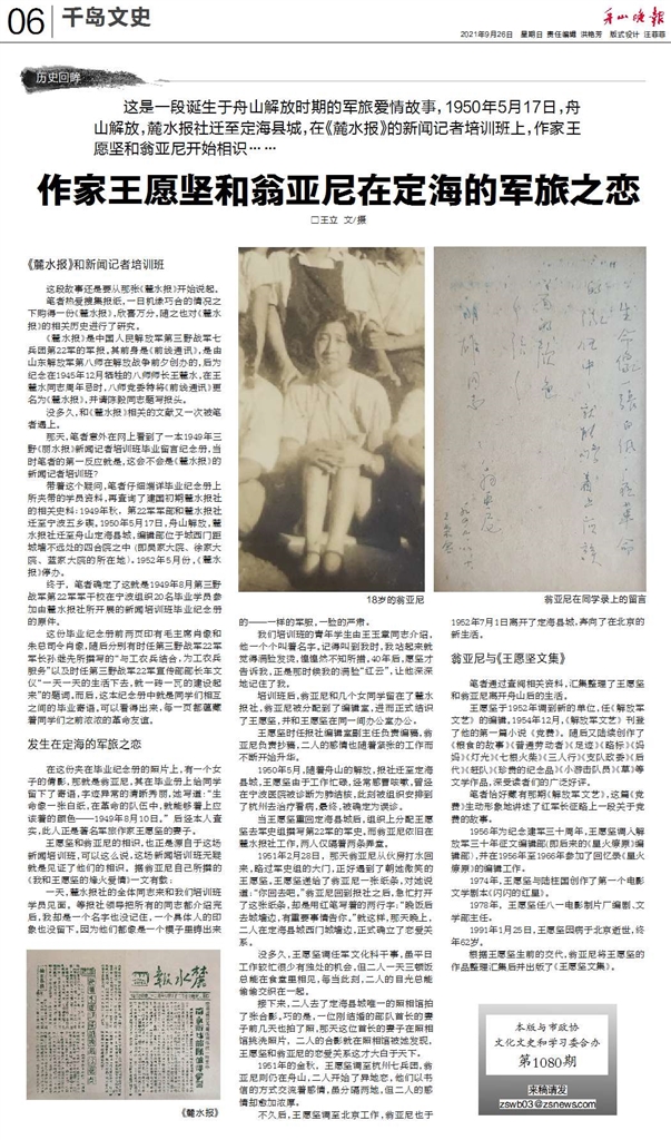 近三年的时间里,王立陆续为“千岛文史”供了二十余篇文史类稿件,也因此与晚报结下了深厚的缘分。晚报改版之际,王立也送来了他的祝愿与期许。