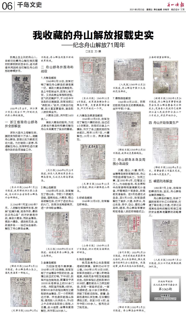 2021年5月,王立给《舟山晚报》投来了他的第一篇文史稿——《我收藏的舟山解放报载史实——纪念舟山解放71周年》,该文从浙江省除舟山群岛外全部解放、舟山群岛外围岛屿解放、舟山群岛本岛及周围小岛战役、舟山开始恢复生产、嵊泗列岛解放等几个维度按照时间顺序介绍了当年舟山解放的一系列情况。