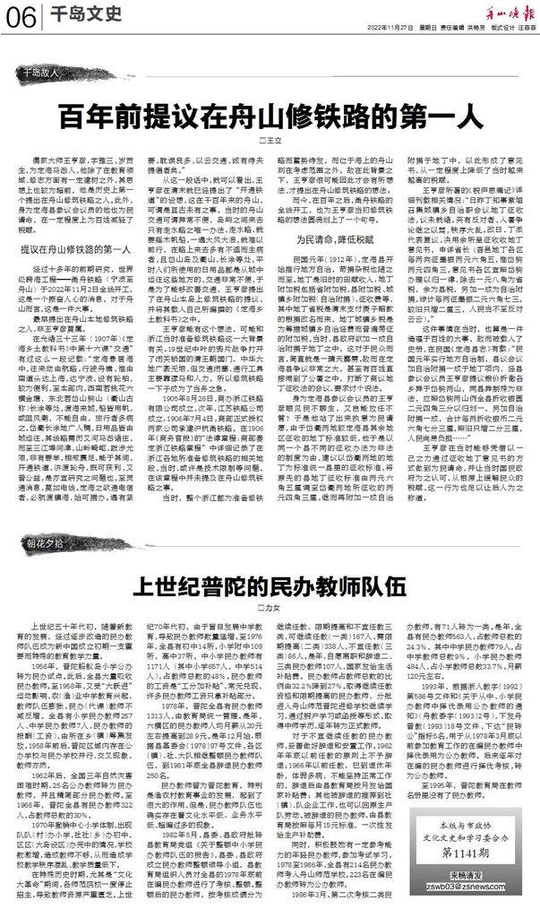 甬舟铁路开工对舟山而言有着重要的历史意义,而能将百年前的人修造铁路的提议为现在的人们所熟知并被官方认可,则更是让王立为之开心的事。创作这篇文章的过程他也记忆犹新,“我在结合前人的研究基础上,重点就王亨彦先生的相关历史进行了更深一步的研究,王亨彦先生不但是百年前提议在舟山修铁路的第一人,而且还是一名杰出的教育家。”