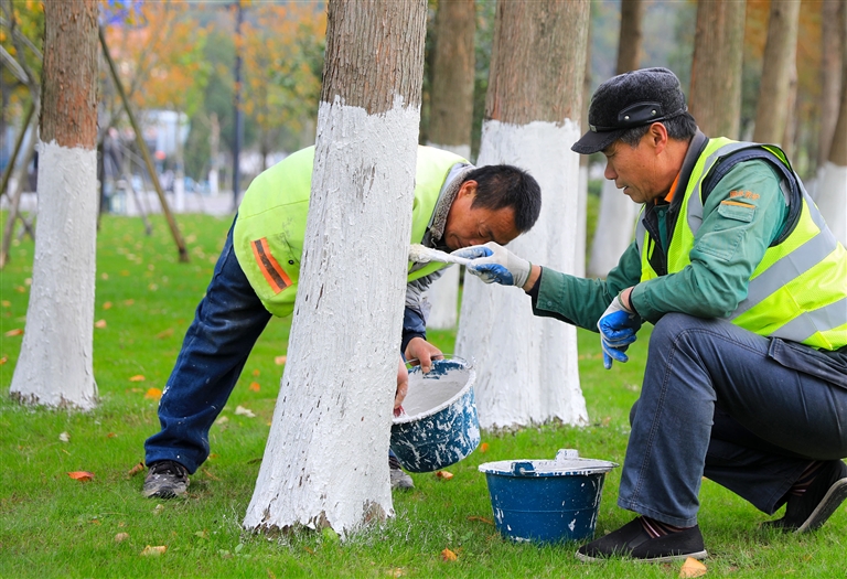 新城樱花公园内,园林工人为树木穿上“冬衣” 记者 陈永建 摄