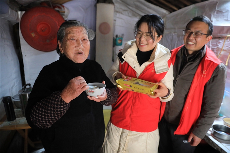 小沙毛峙村,志愿者为老人送上爱心汤圆和精心制作的点心 记者 陈永建 摄