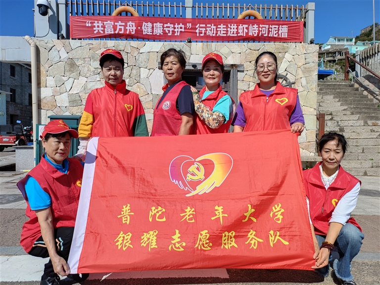 在普陀区老年大学,有一支普陀“共富方舟·健康守护”小分队,人数虽不多,却经常活跃在一次次“共富方舟”行动中。这群“夕阳红”志愿者,年均六旬,他们用自己的行动温暖着一座座偏远海岛。他们就是普陀区老年大学银辉耀党志愿服务队的志愿者。
