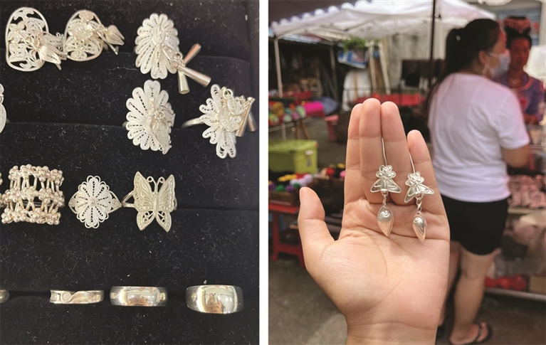 而cc,也碰到了一些机会。她把在市集上买到的苗族银饰品分享在社交媒体上,没想到收到许多私信请她帮忙代购,她便顺势做起了“小生意”。后来她和一家绣片摊位的老板混熟了,还在邀请下帮后者出镜做了一周直播,赚的钱足以支付当时的房租。