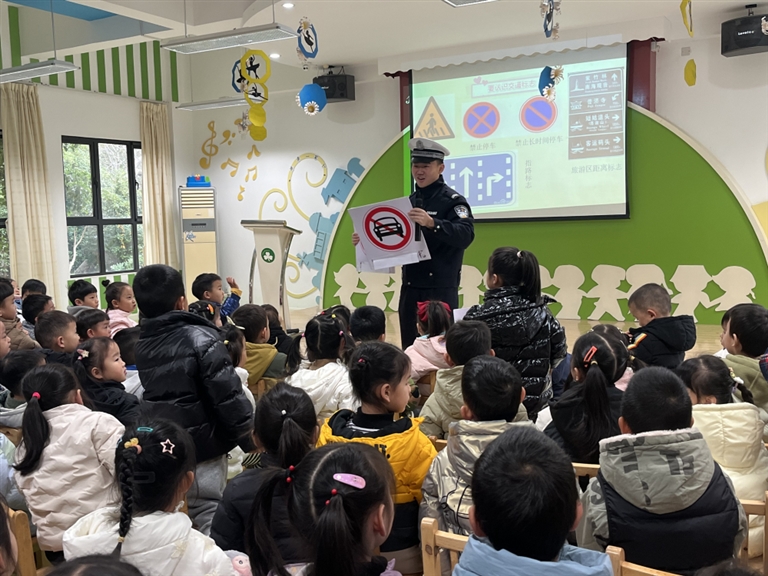 近日,普陀区三盛幼儿园开展了交通安全教育讲座。受邀前来的交警用浅显易懂的语言,生动形象地为小朋友们讲解了有关交通安全的知识,并教小朋友们学习了交通安全法规,认识了交通标识。通讯员 方燕 摄