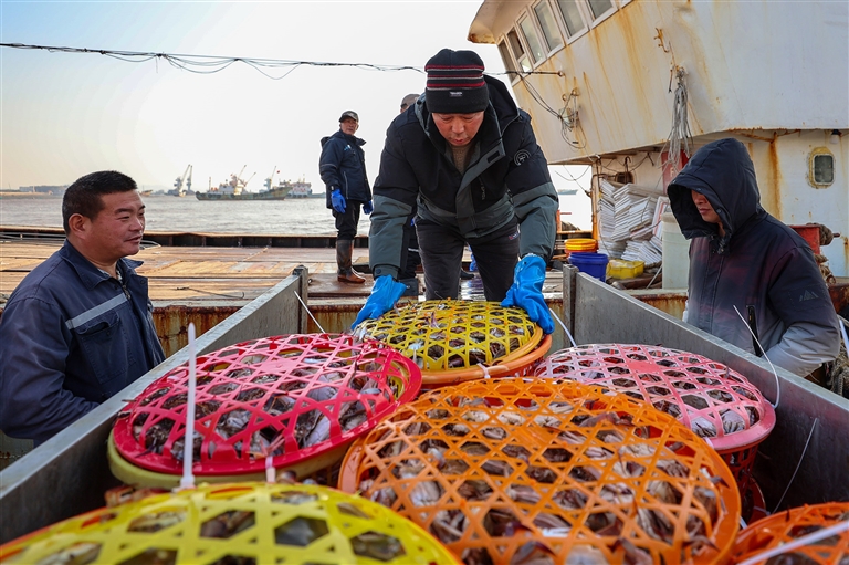 12月24日,舟山国际水产城码头,出海归来的渔船满载鱼货靠岸。工人们忙着将鱼、虾、蟹等新鲜鱼货转运上岸,准备销往各地。通讯员 邹训永 摄