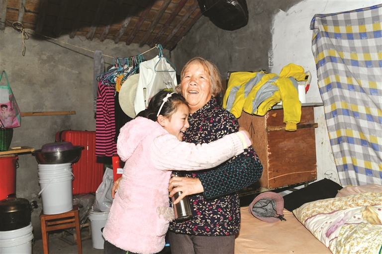 收到热心市民赠送的保温杯后,小晓奶奶高兴地把孙女搂在怀里 (本报2022年1月26日头版报道)