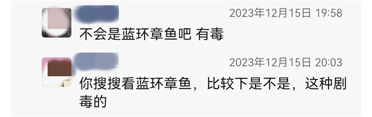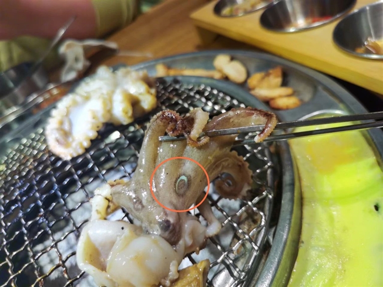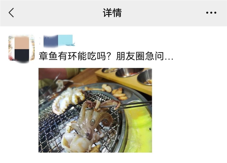 近日,舟山有市民在一家烧烤店用餐时发现,餐桌上的章鱼都有一对环,当时他觉得这和含剧毒的蓝环章鱼挺像,于是就拍照发朋友圈求证,谁知评论大多都是劝他别吃了,吓得这位市民一时手足无措。
