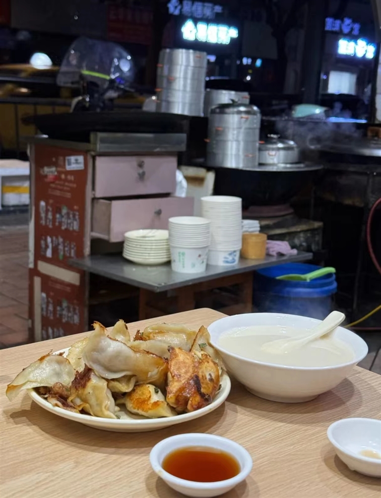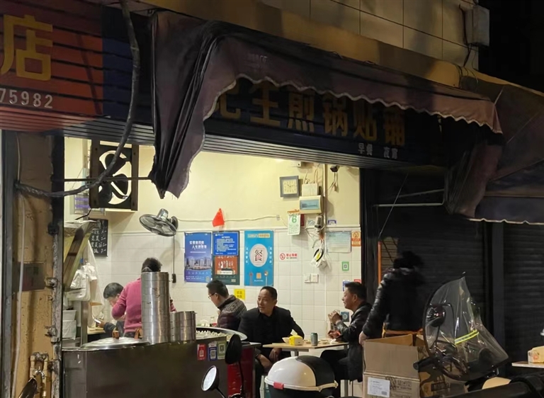 晚餐时分,记者来到了王记生煎锅贴铺。这里的铺面更小,仅有三张桌子的座位,都坐满了人,还有不少顾客站在店门口等待,不少人选择打包。家住东港的小冯特意从东港过来吃锅贴,她告诉记者,虽然这家店在网上的评分只有3.8分,但是她和朋友都非常喜欢,差不多每周或者每半个月要来吃一次。“我有外地朋友来舟山的话,我肯定会带他们来尝尝王记锅贴,再配一碗冰豆浆,基本上吃过的都说好。”