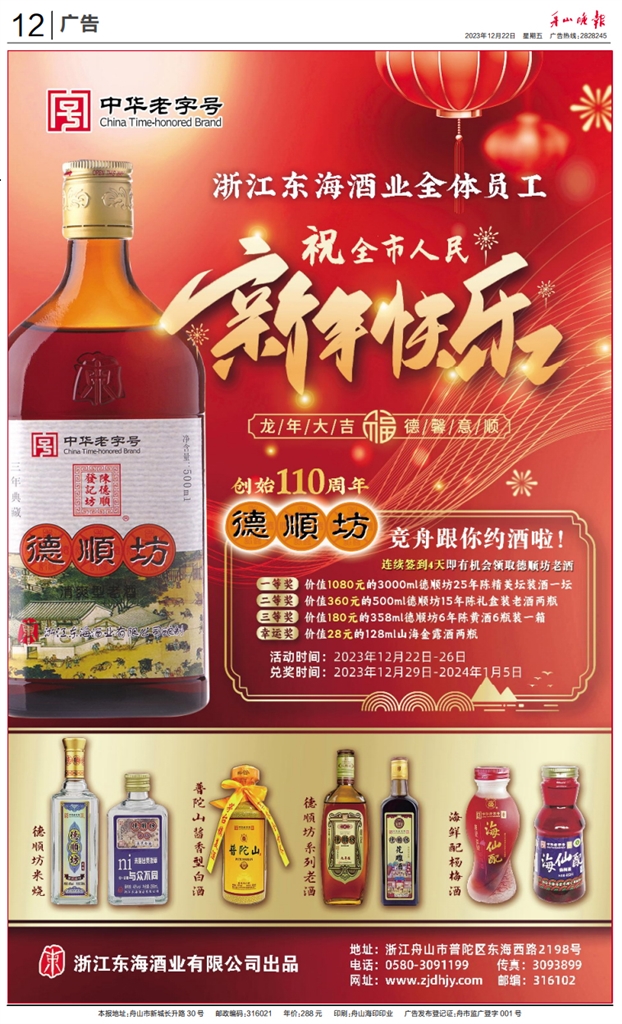 明年是德顺坊创始110周年,12月22日,浙江东海酒业有限公司在晚报投放了最新一期新年广告,并在竞舟客户端发起新年活动,德顺坊25年陈精美坛装酒、德顺坊15年陈礼盒装老酒等参与互动都有机会领取。