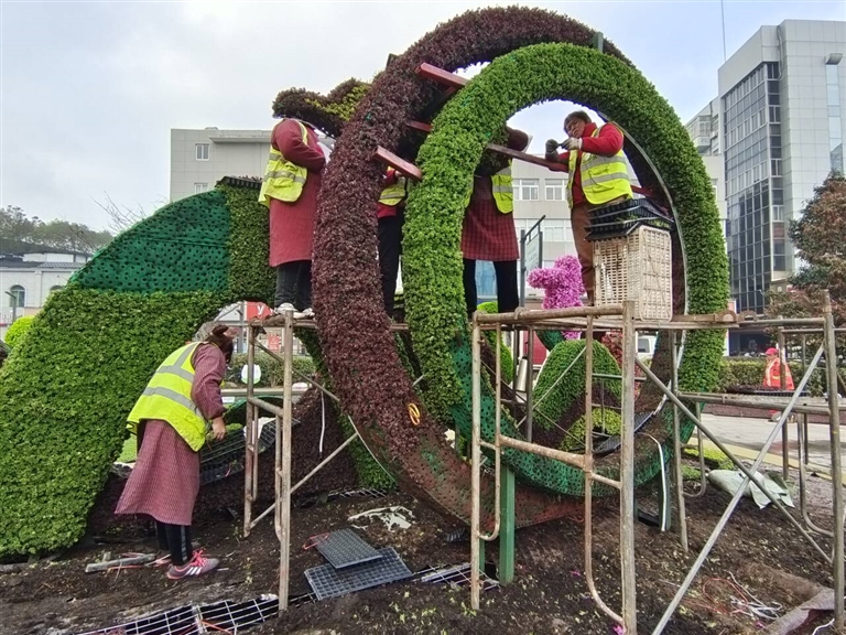 12月28日,园林工人在定海文化广场用花卉、绿植布景,营造浓浓的新年气氛 通讯员 胡社友 摄