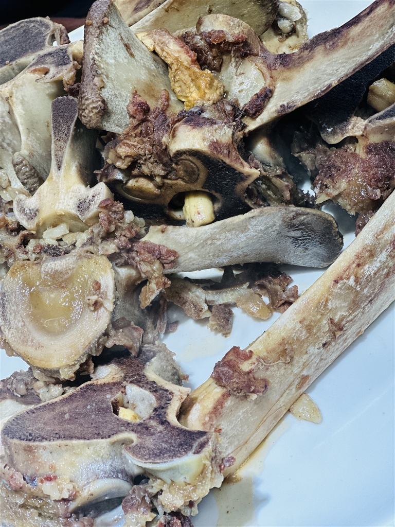 在牛杂店里被一路追捧的牛大骨,在这里仍然是主角,涮火锅时上来一份,戴上手套每人各领一块开啃,也是非常过瘾。以卤和焖双管齐下,此时的牛大骨虽然肉不多,但滋味早已入得骨头里边,两手握住骨头的两边,轻轻一掰,即成两半。啃一啃大骨上仍还连着的筋,吸着大骨里头的骨髓,每一口都是香浓入味。