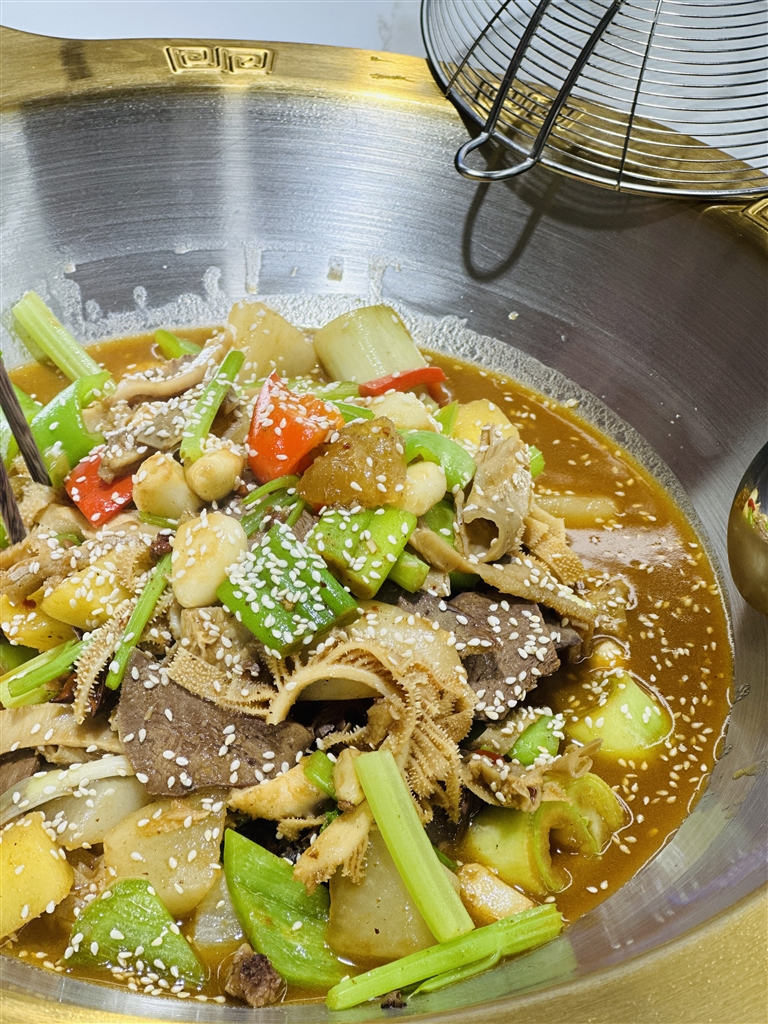 这家养生全牛锅,主打的是有料锅底,比如炒牛杂、香辣牛蹄锅、五香牛排锅、鞭打绣球锅,各种锅底各种千秋,不同的主题各种滋味。先把锅里的“料”吃完,跟着冲入大锅熬煮的牛骨汤,就可以开涮了,牛香四溢。