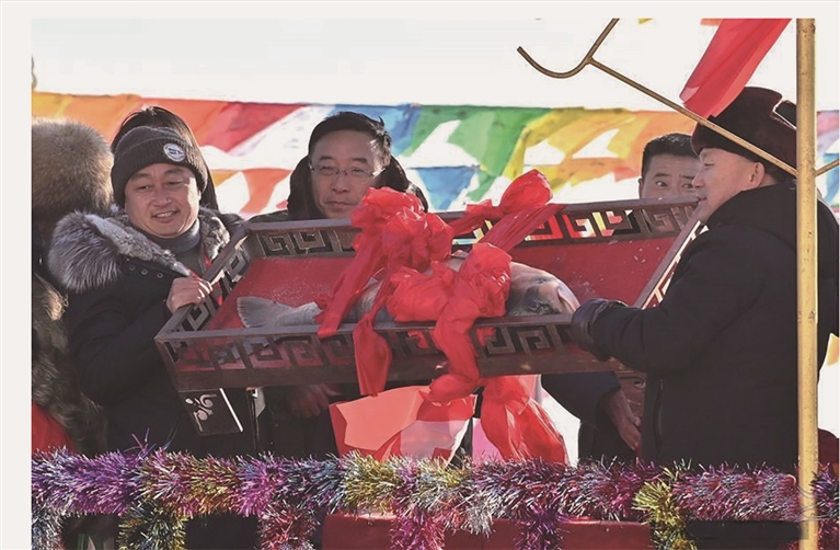 12月28日,吉林松原,查干湖第二十二届冰雪渔猎文化旅游节开幕,来自海内外的数万名游客守在冰面围观“冰湖腾鱼”。在拍卖环节,寓意吉祥的“头鱼”拍出1399999元。中新网 图