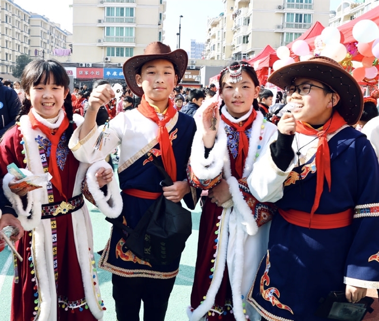 2023年12月29日下午,沈家门第四小学的校园里热闹非凡,操场上正在开展一场民俗民风同乐会,代表云南、广西、四川等省份的摊位一字排开,各省特色逐一亮相。