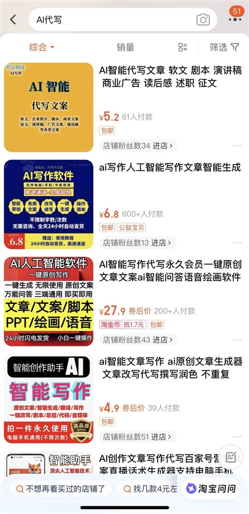 “AI代写文案,软文、剧本、征文、演讲稿、述职报告等,应有尽有,省时省力!”在一家网店,商家标出5.2元的AI代写价格,销售量超过600份。