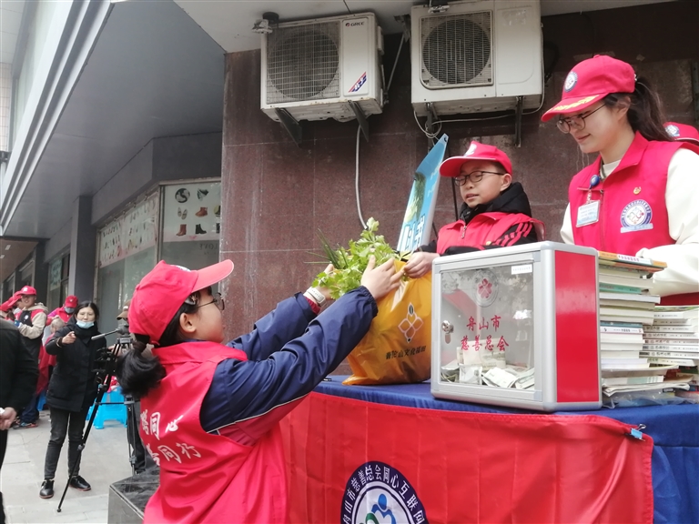 现场,定海海山小学和定海五中的学生代表等群体将闲置的图书进行捐赠,换取一份新鲜的普陀山福田蔬菜,以此孝敬家中的长辈。活动得到了普陀山文化福田的大力支持,共捐赠了芹菜、葱等各种蔬菜约150公斤,由志愿者分装成约100份。