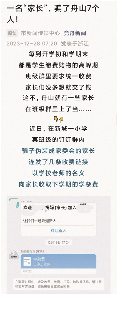 近日,在新城一小学某班级的钉钉群内,骗子伪装成家委会的家长连发了几条收费链接,以学校老师的名义向家长收取下学期的学杂费。由于该账号显示“涉嫌违规”,不少家长纷纷表示质疑,但仍有7位通过链接付了款,每人转账300多元(竞舟客户端报道)。