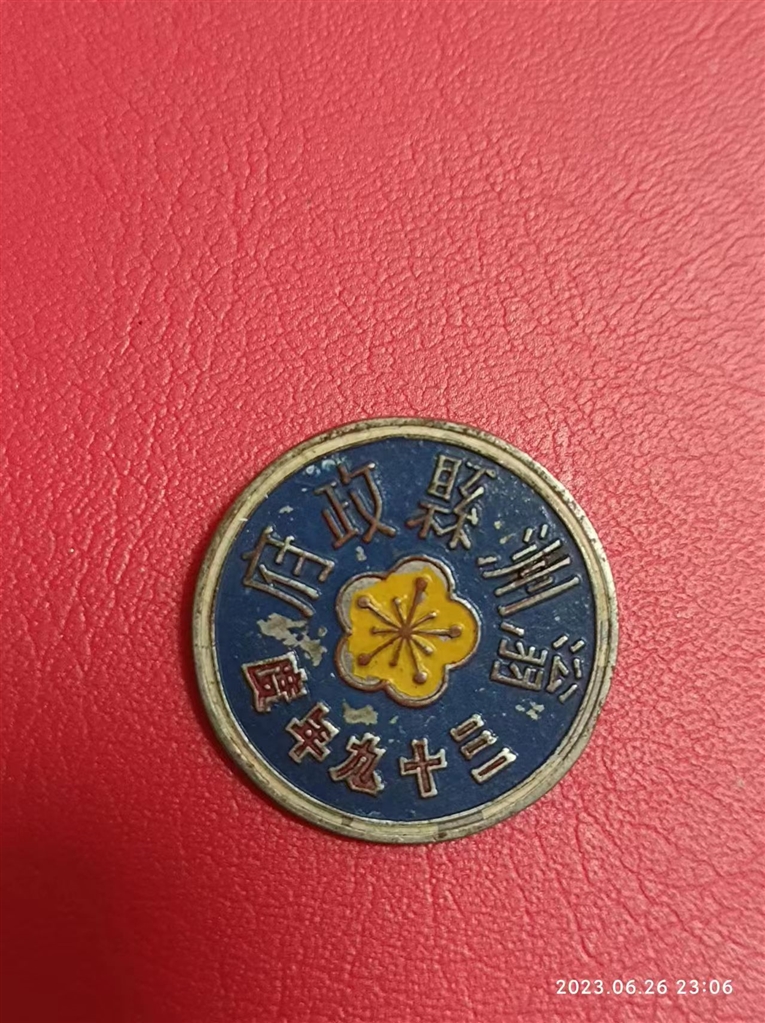 此章铜质,直径3厘米,中间饰黄色梅花图案。