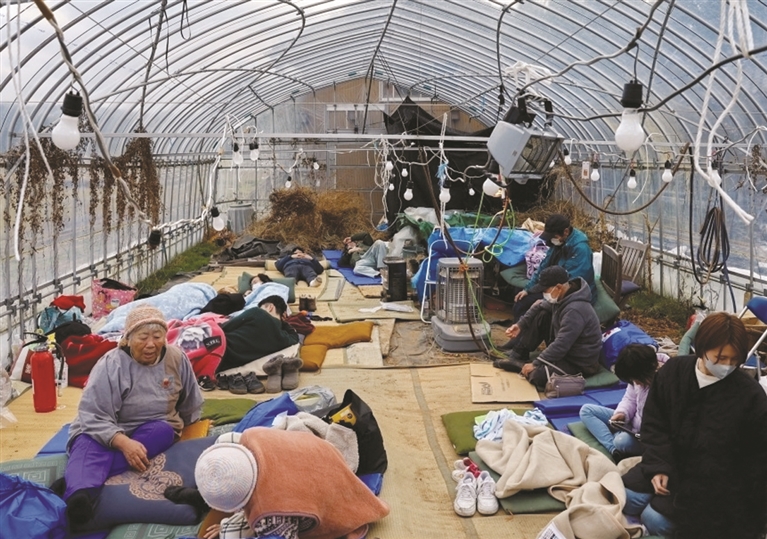 日本石川县能登半岛3日上午发生5.5级余震,重灾区轮岛市震感强烈。据石川县政府3日公布的数据,能登半岛地震已造成该县64人死亡。地震造成部分房屋倒塌、地面下沉。震中附近地区受灾情况严重,石川县和富山县等地已有超3万人避难。图为民众在改建为疏散中心的温室帐篷内休息。