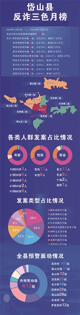 2023年,电信网络诈骗案频发,严重危害社会秩序,损害人民群众的财产安全。岱山公安根据全县各辖区去年12月份发案情况,晾晒全县反诈三色月榜单。