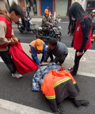 在等待救护车到来前,张帅带领大学生志愿者科学研判老人伤势,为保护老人避免二次骨折,张帅和志愿者以及路过的环卫阿姨都脱下棉袄,盖在老人身上进行保暖,女大学生志愿者一直陪在旁边和老人说话,让老人保持清醒,另一位志愿者在现场引导车辆避免撞到老人。