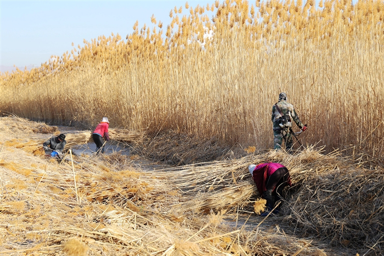 日前,甘肃张掖国家湿地公园茂盛的芦苇在阳光的照射下一片金黄,工人们忙着采割、装载、运输芦苇。芦苇可以调节气候、涵养水源,采收后可以作为造纸、建材、工艺品的原材料,也可作为防沙治沙的材料。 据人民网