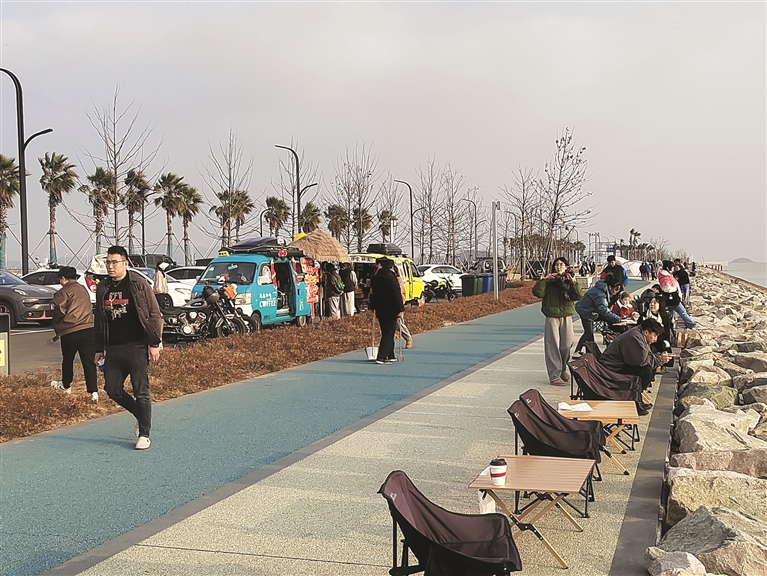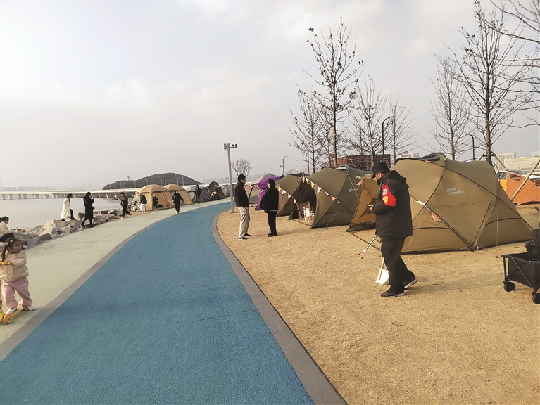 哪怕是朔风凛冽,只要有一丝阳光,新城小干岛茶山大桥脚下,总会支起十数顶帐篷。沿着海岸边,再摆开一排休闲椅,市民和游客对着大海,捧一杯热咖啡,度过闲暇时光。