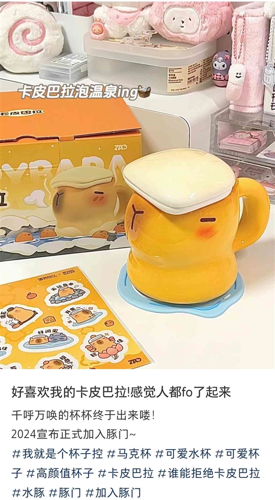 像小肖一样遁入“豚门”的年轻人还有不少,自从水豚火遍社交平台,29岁的小吴也入了不少周边好物。“买了一件水豚珊瑚绒睡衣,帽子上还有橘子夹子。前几天,在小红书上看到网友分享的一个水豚杯子很可爱,我也买了。”小吴表示,在工位和居家环境中增添水豚周边,能让自己舒缓神经,学着做一只淡定的水豚,“买这些周边说到底是在买一种情绪价值,水豚代表的就是一种极低内耗的心态,也是当代打工人很缺乏的状态。大家这么喜欢水豚也正是因为自己处在高压的环境中,羡慕这种状态。”