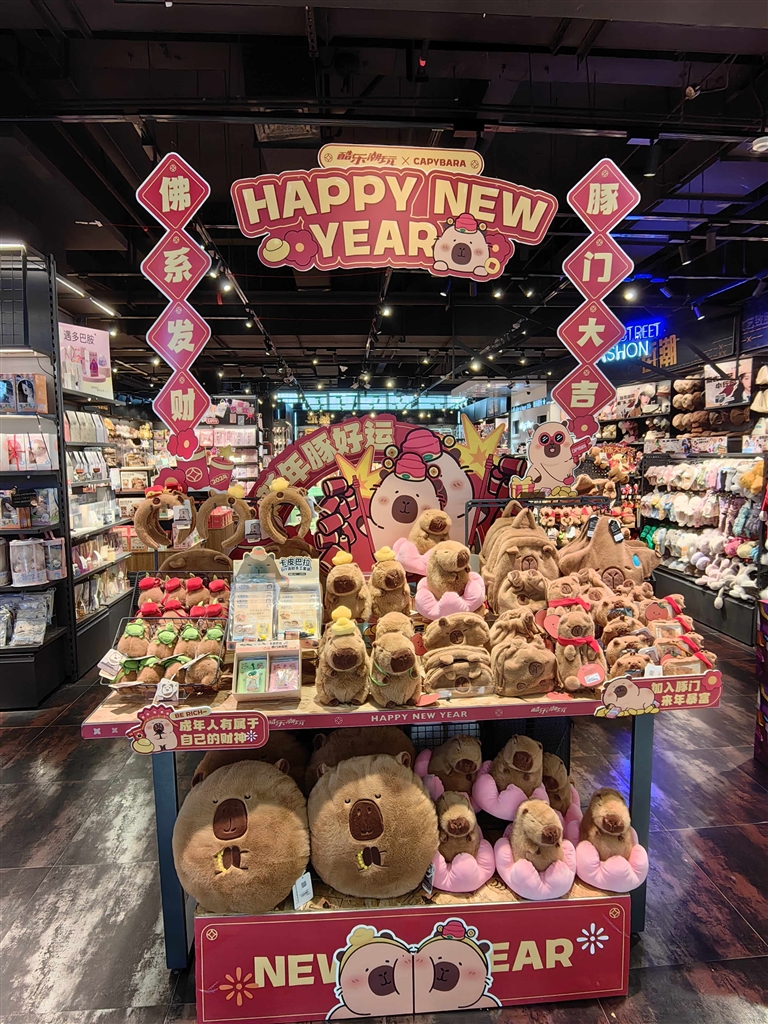 1月10日上午,记者来到了新城凯虹广场的酷乐潮玩杂货店,在门口醒目的位置就有一个水豚摊位,摆出的水豚周边有水豚发箍、玩偶、挂件、耳机包、卡包、收纳袋等。摊位上方还挂了两道春联“豚门大吉,佛系发财”。