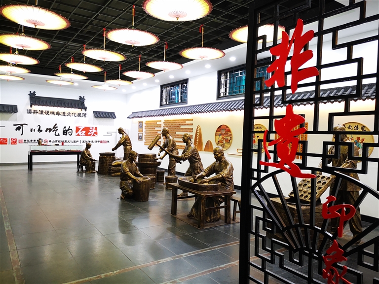 糯米、芝麻,与精白糖等原料搅和一起,按照祖传秘方,经过炒、磨、拌、扦、蒸、焙等多道工序,“倭井潭硬糕”便诞生了,储存十天、半个月,不腐不烂。以前,只有渔民坚如铜耙的牙齿才能把它压碎,慢慢用牙齿碾磨。如今,倭井潭硬糕也在求变。