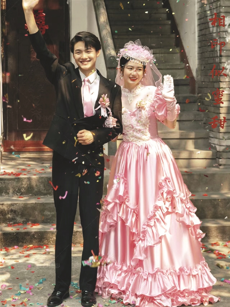 “上世纪90年代初,婚纱店也有几家开起来了。但是婚纱的颜色还是以红色、粉色为主,白色的很少,因为在我们的观念里,结婚是喜庆的日子,而白色不太吉利。所以我当时结婚穿的就是粉色。比我们再早几年结婚的人穿的还是红色的上下装套裙。”陈女士说,婚纱也是港风,还会带上同色系的手套和头纱,头发烫得卷卷的。男士也开始穿上了西装,系一条粉色或者红色的领带,绝对是最洋气的婚礼。