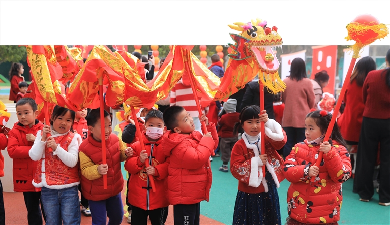 近日,新城翁浦幼儿园开展“品民俗 迎新春”主题游园活动,400余名师生欢聚一堂。《舞龙舞狮》《幼儿民俗舞蹈》《福星送祝福》等节目引得娃儿们欢笑连连。记者 陈永建 通讯员 洪露楠 摄