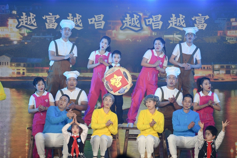“共富路上,越富越唱,越唱越富……”表演唱《富起来唱起来》节奏欢快、歌声优美,唱出了渔民发家致富的好心情,台下响起阵阵掌声。据了解,该节目由普朱管委会朱家尖街道莲兴村文化礼堂选送,代表舟山参加2023年“我要上村晚”村歌大赛决赛,获得冠军。