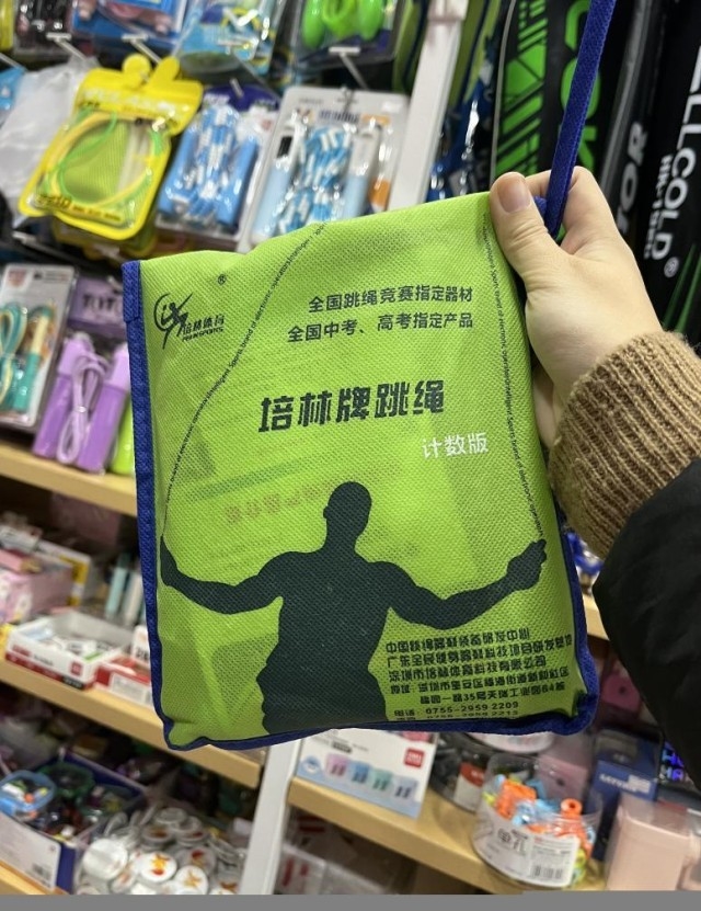 在重庆,记者以家长身份走访主城区多家中学周边文具店,问及是否售卖“中考跳绳”时,多名店主不约而同向记者推荐同一品牌——培林牌跳绳。