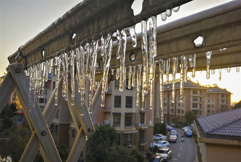 前段时间的寒潮中,晾衣架上的水冻成了冰柱子 记者 张磊 摄