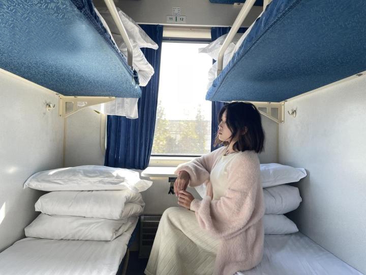 李欣意在硬卧车厢拍照留念