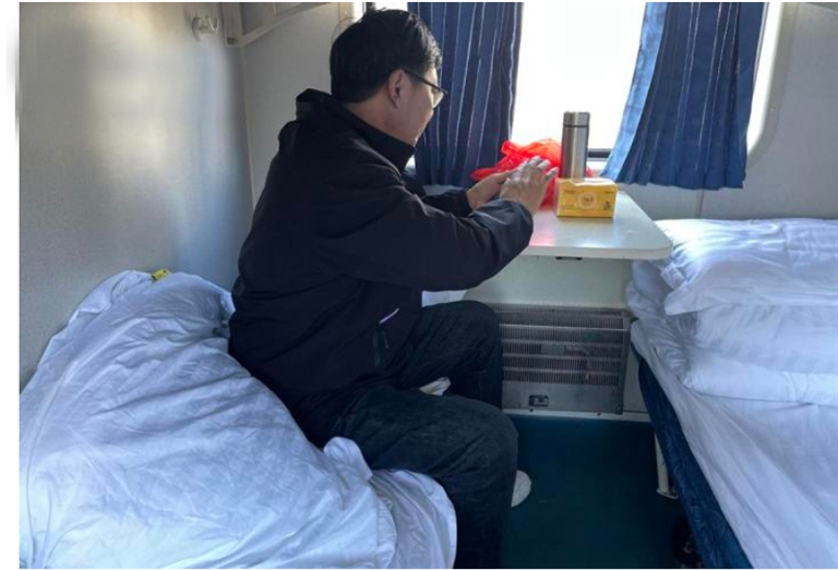 他曾买过上铺,空间相对窄些,这次睡在下铺,舒适不少,“我也不太懂,都是我家孩子抢的票。”他有些内敛,提起孩子,倒是多说了几句。