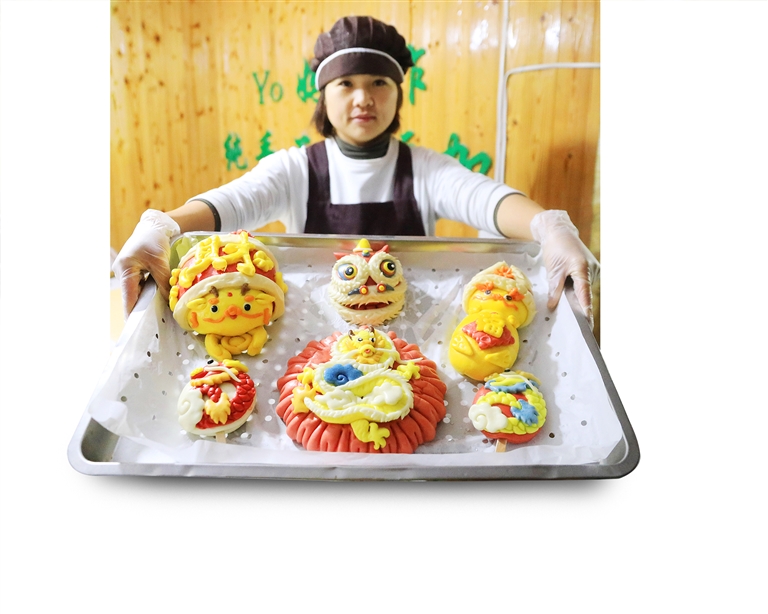 昨天,在位于普陀区展茅街道大展村的“Yo妈手作”工作室内,村民们正在赶制龙年花馍订单。春节临近,该工作室制作的龙年花馍有祥云盘龙、国潮醒狮、龙宝、龙年双色冰淇淋等十余个品类,款式多样,寓意吉祥,市场价能卖到十余元至上百元不等。记者 陈永建 摄